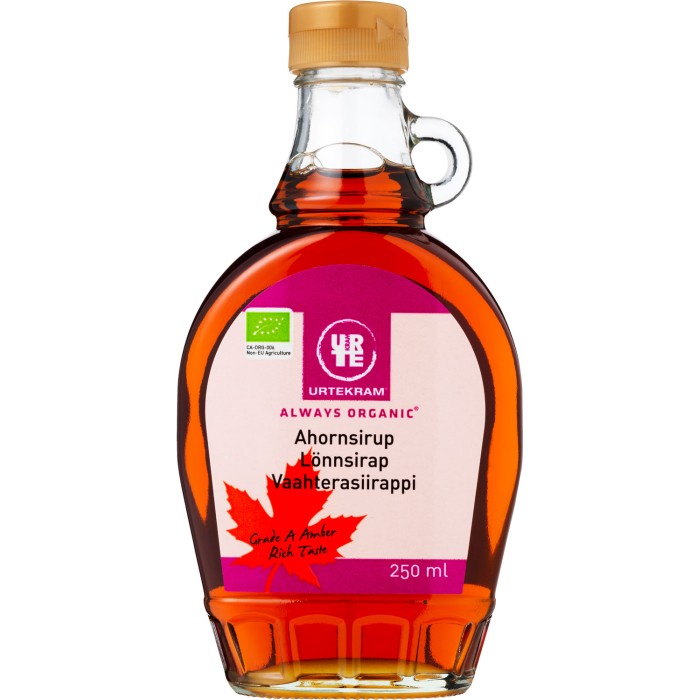 Urtekrams lönnsirap kommer från de kanadensiska skogarna. Passar bra att använda i t.ex. desserter, på gröt och pannkakor eller som sötningsmedel i varma drycker. Har en fin och unik smak.