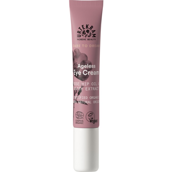 Urtekram Dare to Dream Ageless Eye Cream är en ögonkräm med nyponrosolja och tusensköna-extrakt som hjälper till att motverka ålderstecken, fina linjer, mörka ringar och påsar under ögonen.