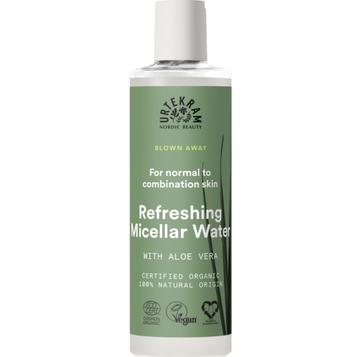 Urtekram Blown Away Refreshing Micellar Water är en effektiv och mild rengöringsprodukt för ansiktet som tar bort orenheter och makeup i ett svep. Refreshing Micellar Water drar till sig smuts och makeup utan att man behöver gnugga huden. Använd en bomullsrondell vid applicering och rengör sedan huden kring ögonen, ansiktet och läpparna. Urtekram Micellar Water har en formulering som är berikad med apelsinolja och sockerbetsextrakt för att vara återfuktande.