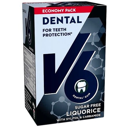 V6 Dental är V6 klassiska tuggummi med xylitol som hjälper till att vårda dina tänder varje gång du tuggar. Tuggummit neutraliserar placksyror som orsakar karies och hjälper till att minska plackbildning. V6 Dental Liquorice har en fräsch smak av lakrits.