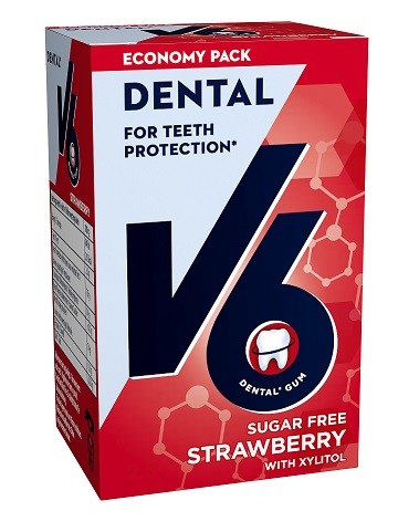 V6 Dental Strawberry Mint är ett tuggummi med xylitol som vårdar dina tänder varje gång du tuggar. V6 tuggummi rengör tänderna och gör dem friskare. Tuggummit neutraliserar syror som orsakar karies och hjälper till att minska plackbildning. V6 Strawberry Mint har en smak av jordgubb och mint.