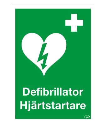 Enkelsidig skylt i plast att fästa på väggen för att markera att hjärtstartare finns här.