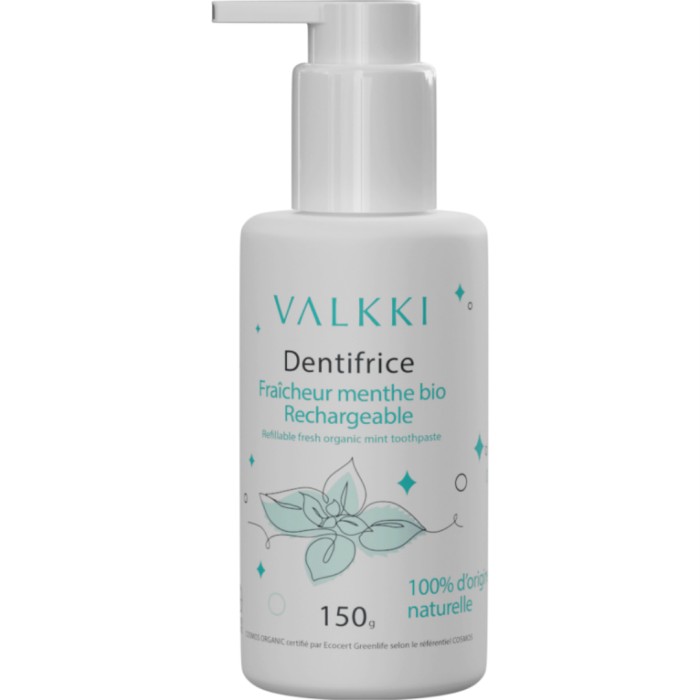 Valkki Fresh Mint är en tandkräm utan fluor, med mintsmak. Tandkrämen är gjord på naturliga ingredienser. Påfyllningsbara flaska med pump. Innehåller ej fluor.