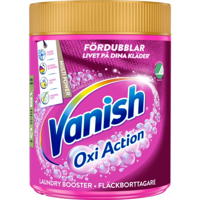Vanish Pink Multi Power Pulver med Vanish bästa fläckborttagande formula tar bort fläckar, även från kroppsvätskor som t ex svett på manschetter och kragar. Tar bort tuffa fläckar som syns tydligt och de fläckar som kan vara dolda djupt inne i tyget. Ger ett bra resultat på bara 30 sekunder.