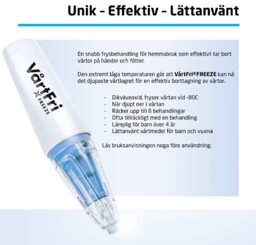 VårtFri Freeze är en vårtbehandling för hemmabruk som tar bort vårtor på händer, armar och fötter. Ej lämplig för barn under 4 år.