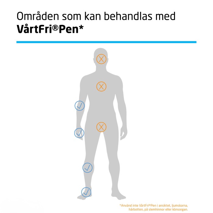 VårtFri Pen är en lättanvänd penn-applikator för borttagning av vårtor hemma. VårtFri är ett effektivt och lättanvänt vårtmedel för både barn och vuxna. VårtFri Pen torkar effektivt ut vårtor på händer, fötter, armbågar och knän. Absorberas direkt in i vårtan och lämnar inga spår på huden. Använd en gång i veckan. Vanligtvis behövs 5-15 behandlingar. VårtFri Pen räcker till ca 30 behandlingar. Kan användas vid behandling av flera vårtor. Kan användas till både barn och vuxna. (Kontakta läkare eller BVC innan behandling av barn under 4 år.)