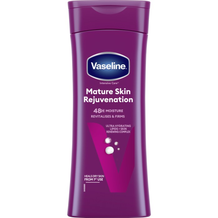 Vaseline Mature Skin Rejuvenation Lotion är dermatologiskt testad hudlotion anpassad för en mer mogen hud som börjat tappa lyster och spänst. Lotionen innehåller trippelrenad Vaseline gele och pro-lipider för att ge huden återfuktning i upp till 48 timmar. En lotion med en kladdfri formulering.