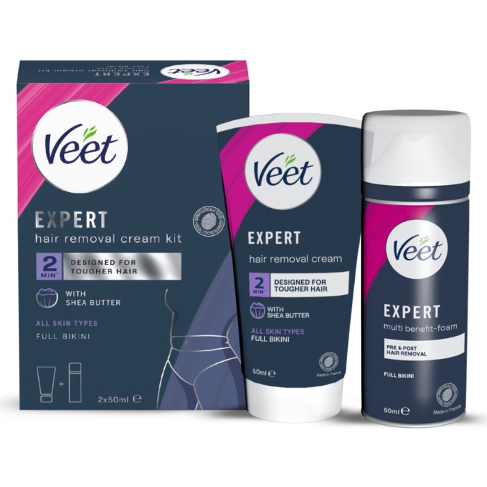 Veet Expert Hårborttagningskit för intimområdet kan användas till hela bikiniområdet och passar för alla hudtyper, även känslig hud. Kitet innehåller en kräm för hårborttagning (50 ml) och ett skum (50 ml) som kan användas före, efter och mellan hårborttagningstillfällena.