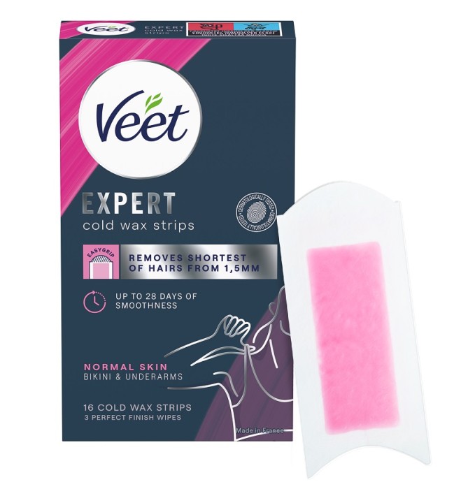 Veet Expert Cold Wax Strips Bikini & Underarms är vaxremsor för normal hud för hårborttagning vid bikinilinjen och under armarna.