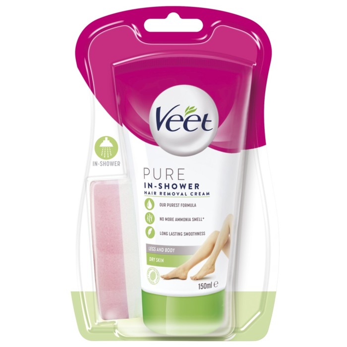 Veet In Shower Hair Removal Cream för torr hud innehåller återfuktande sheasmör och en kombination av vattenresistenta ingredienser för att kunna verka i duschen.