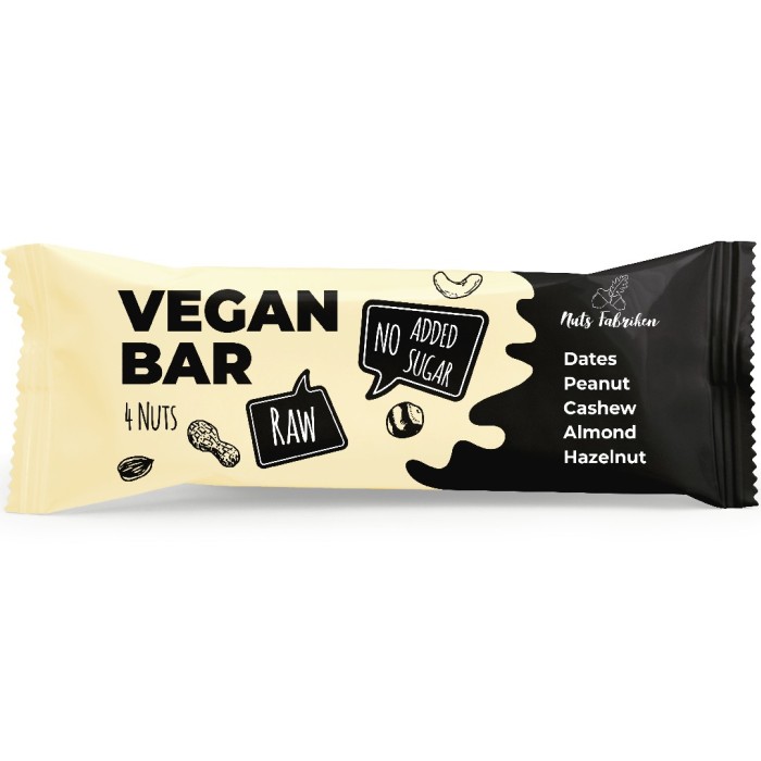 Vegan Bar 4 Nuts från NutsFabriken är en raw bar gjord på naturliga ingredienser. Denna bar innehåller 60 % dadlar, samt jordnötssmör, jordnötter, cashewnötter, mandlar och hasselnötter. Ett enkelt, naturligt och gott mellanmål.