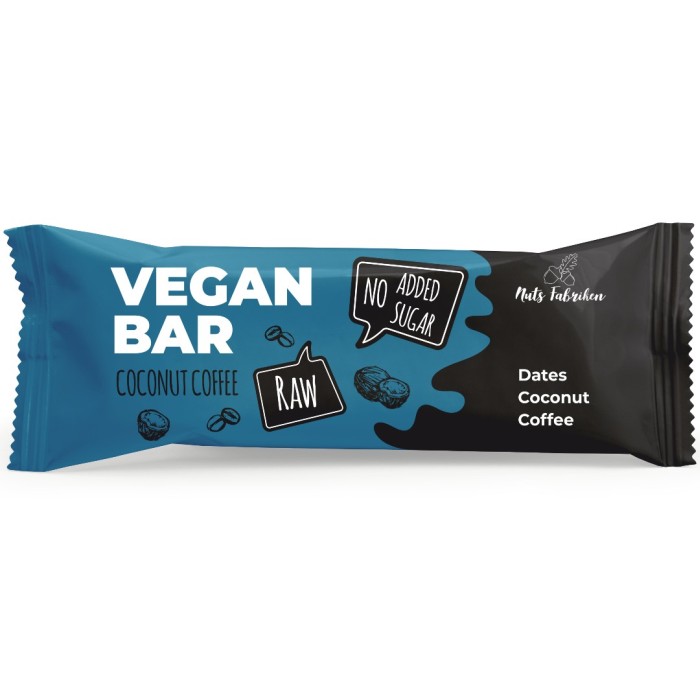 NutsFabrikens bar Vegan Bar Coconut Coffee är en raw frukt- och nötbar gjord på endast naturliga ingredienser. Baren är gjord på dadlar (64%), kokosflingor och malet kaffe - en lite ovanlig smakkombination som kan ge lite extra energi till din dag.