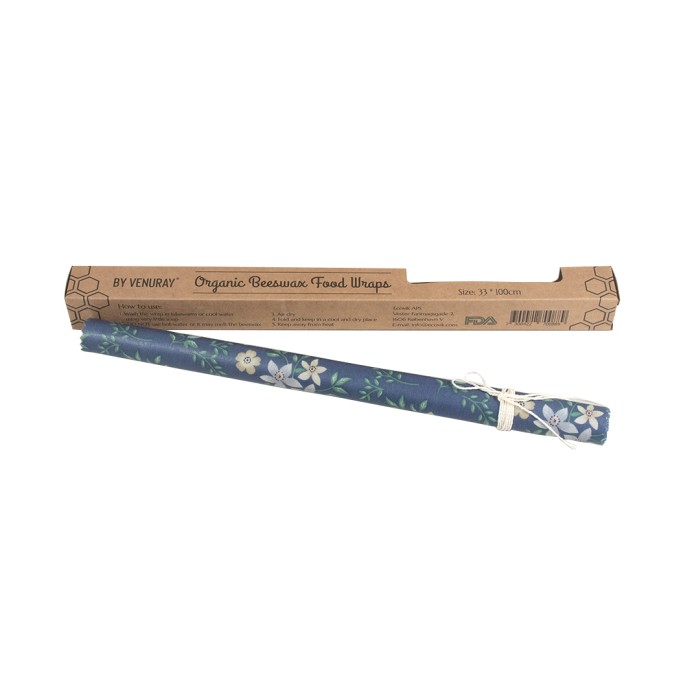 Bivaxrullen från Venuray är ett återanvändbart alternativ till plastfolie när du ska bevara matrester. Denna bivaxrulle har ett fint blommönster.