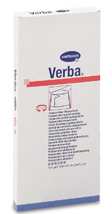 Verba är ett brett, elastiskt bandage med kardborreförslutning. Lämpar sig för alla stöd- och kompressionsförband runt bålen särskilt för tidig mobilisering utan komplikationer efter thorax- och bukoperationer. Verba har en hög stabilitet på tvären vilket gör att bandaget sitter stadigt utan att det bildas besvärande veck eller ojämnheter. Kardborreförslutningen underlättar byte av sårförbandet. Höjd 25 cm. Osteril styckförpackad i ask. 1 st.