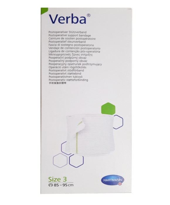 Verba är ett brett, elastiskt bandage med kardborreförslutning. Det lämpar sig för alla stöd- och kompressionsförband runt bålen, särskilt för tidig mobilisering utan komplikationer efter thorax- och bukoperationer. Har en hög stabilitet på tvären vilket gör att bandaget sitter stadigt utan att det bildas besvärande veck eller ojämnheter. Kardborreförslutningen underlättar byte av sårförbandet. Höjd 25 cm. Osteril styckförpackad i ask. 1 st.