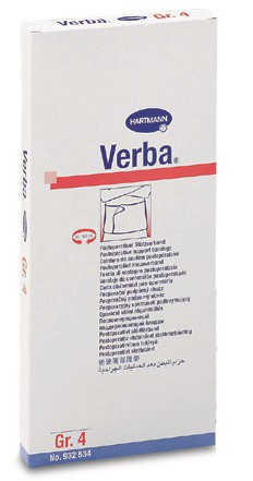 Verba är ett brett, elastiskt bandage med kardborreförslutning. Det lämpar sig för alla stöd- och kompressionsförband runt bålen särskilt för tidig mobilisering utan komplikationer efter thorax- och bukoperationer. Har en hög stabilitet på tvären vilket gör att bandaget sitter stadigt utan att det bildas besvärande veck eller ojämnheter. Kardborreförslutningen underlättar byte av sårförbandet. Höjd 25 cm. Osteril styckförpackad i ask. 1 st.