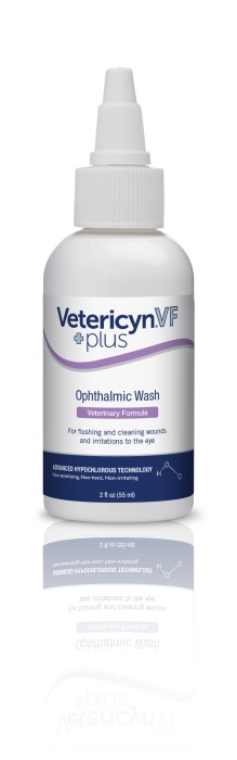 Vetericyn VF+ Antimicrobial Ophthalmic Wash är en vattenbaserade antiseptisk ögonskölj för djur. Ögonsköljen används för rengöring av kliande, irriterade ögonen och sår runt ögonen samt förebygger missfärgning av vita hårstrån vid regelbunden användning. Vetericyn ögonvårdsprodukter rekommenderas som en förebyggande åtgärd, särskilt hos individer som utvecklar allergiska symtom efter exponering för miljöirritation. Regelbunden användning av Vetericyn ögonskölj förhindrar rödbrun missfärgning av vit päls (färgas av överflödande tårvätska).