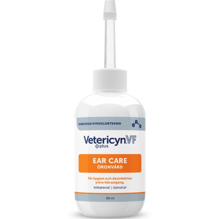 Vetericyn VF+ Ear Care är en vattenbaserad antimikrobiell öronskölj för djur. Vetericyn VF+ öronvård används för rengöring av sår runt öronen och hörselgången, och för första hjälpen vid tecken på öronirritation. Rekommenderas som en förebyggande åtgärd, särskilt hos individer som behöver regelbunden rengöring av öronen. Hos problemindivider (t ex allergiska djur och djur med återkommande öronsymptom), är det viktigt att hålla öronen rena.