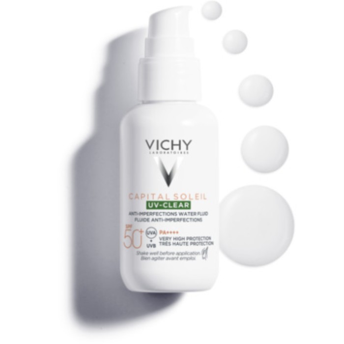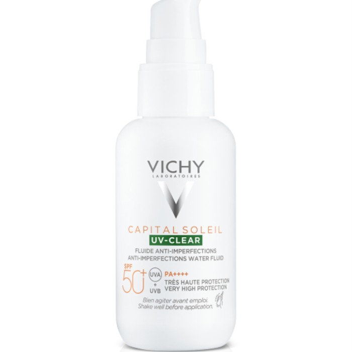 Capital Soleil UV-Clear Anti-Imperfections Water Fluid SPF50+ från Vichy är ett solskydd för fet hud med tendens till orenheter. Solskyddet har en ultralätt konsistens och kan användas för dagligt solskydd för fet och oren hud. Skyddar huden mot UVA- och UVB-strålar. Reducerar och förebygger märken, orenheter och glansig hud.