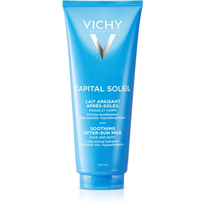 Vichy Idéal Soleil Soothing After Sun Milk används på kroppen efter en dag i solen. Capital Soleil After Sun har en uppfriskande konsistens som ger en svalkande känsla. Fuktbalansen i huden återställs och krämen mjukgör och återuppbygger hudens skyddsbarriär. Kan användas på alla hudtyper.