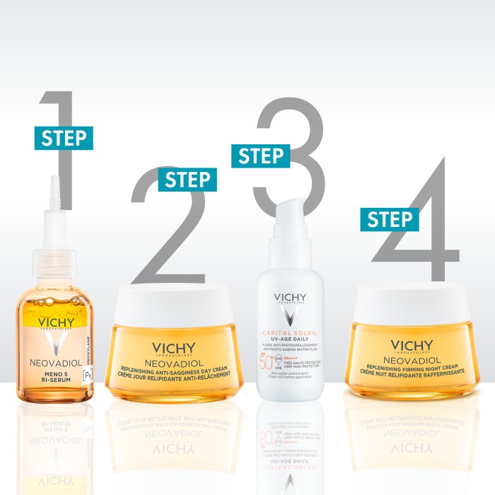 Vichy Neovadiol Post-Menopause dagkräm är speciellt utvecklad för den känsliga huden efter klimakteriet och ger resultat redan efter första appliceringen. Krämen innehåller Proxylane, Cassia-extrakt, vitamin B3 och omega-3-6-9, som reducerar rynkor, ger fyllighet och ökad spänst, samtidigt som den tillför fukt och näring. Dagkrämen är enkel att applicera och har en behaglig doft, och efter regelbunden användning upplevs huden mjukare och uppstramad och uppfräschad med en jämnare hudton.