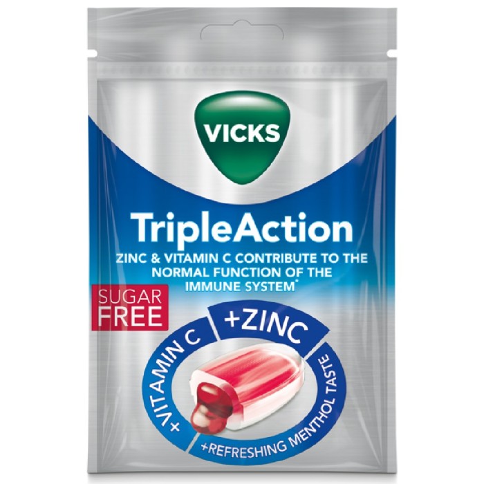 Vicks Triple Action är sockerfria halstabletter som känns lindrande och lenande vid förkylning. Ger en uppfräschande känsla till halsen och för andedräkten. Smak av menthol.