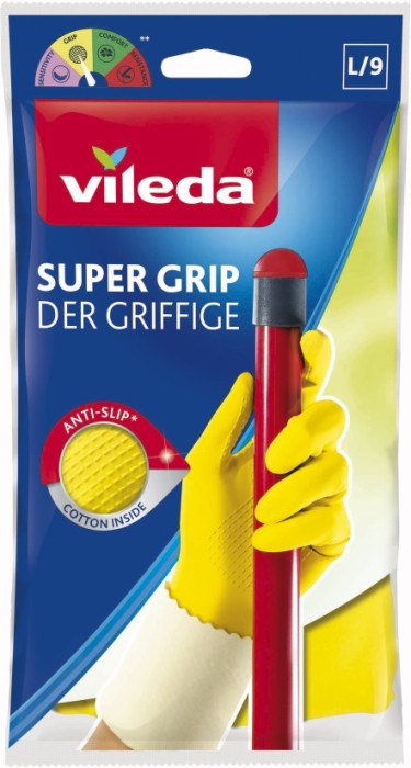 Vileda Super Grip är en greppvänlig hushållshandske tillverkad av latex (naturgummi) som ger ett bra skydd samtidigt som de är mycket praktiska.