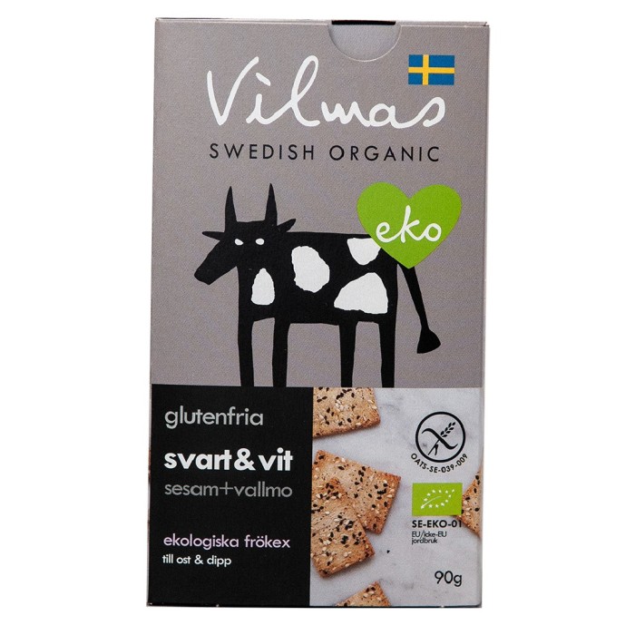 Vilmas ekologiska frökex är toppade med svarta och vita sesamfrön, vallmo och havssalt. De har en nötig och nästan lite pepprig smak, som passar perfekt till ostar eller middagar. Knäcket är kraftigt saltat.