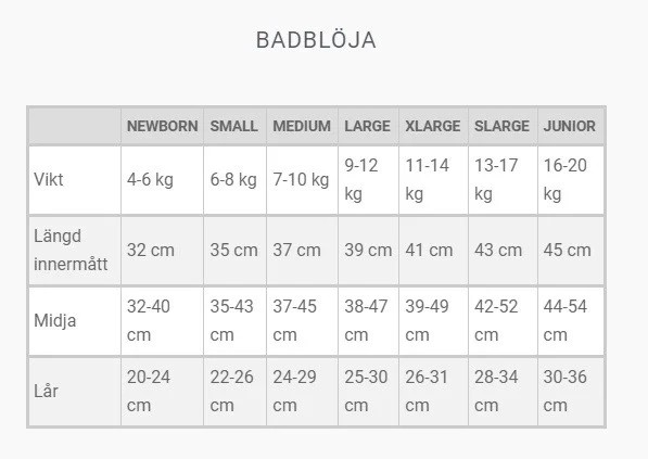 Utgå efter lår- och midjemått för bäst passform. Är du osäker kring storlek och väljer mellan två olika, ta den mindre. Det är viktigt att blöjan sitter åt kring lår och midja för att undvika läckage. Ta gärna hjälp av bilden med måttabellen inför val av storlek!