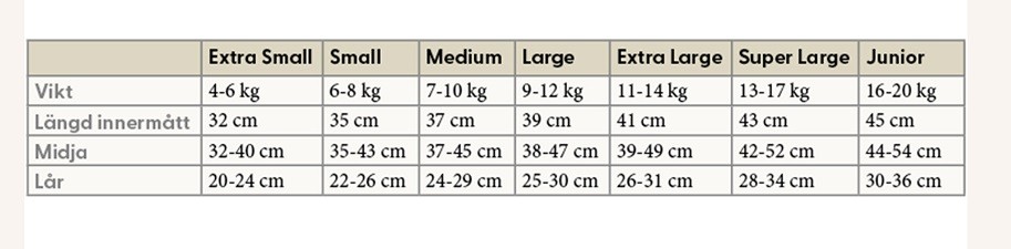 För att välja rätt storlek: Utgå från lår- och midjemått för bästa passform. Är du osäker kring storlek och står och väljer mellan två olika, ta den mindre storleken. Det är viktigt att blöjan sitter åt bra kring lår och midja för att undvika läckage. (Ta gärna hjälp av bilden med måttabellen för att läsa mer inför val av storlek!) S - 6-8 kg, M - 7-10 kg, L - 9-12 kg, XL - 11-14 kg, XXL - 13-17 kg.