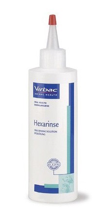 Virbac Hexarinse är en klorhexidinlösning till hund och katt som motverkar infektioner i djurets mun.