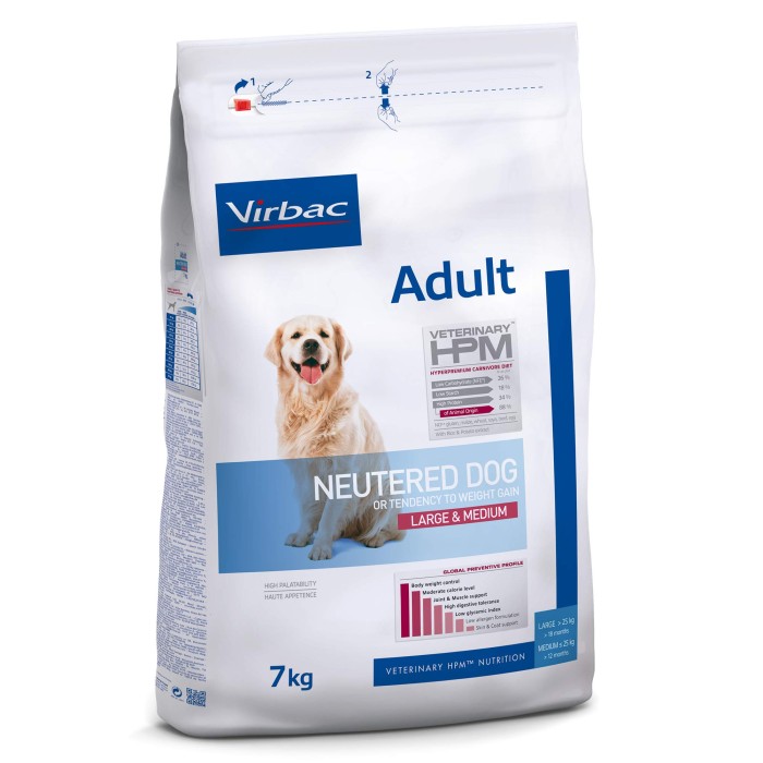 Virbac HPM Adult Neutered Dog Large & Medium är ett foder till kastrerade vuxna hundar av stora raser (<25kg) från 18 månaders ålder samt till kastrerade vuxna hundar av medelstora raser (11-25kg) från 12 månaders ålder. VETERINARY HPM hjälper till att bevara en optimal vikt, bevara muskelmassan och begränsa fettvävnadsdepositionen. Det kan även hjälpa till att säkerställa en stabil blodglukosnivå, säkerställa en balanserad magtarmflora, ge en välformad avföring tack vare hög smältbarhet samt främja en frisk och stark hud och päls.