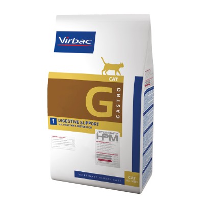 Virbac Cat G1 Gastro Digestive Support är ett foder till katter med mag- och tarmbesvär. GASTRO 1 har ett högt innehåll av viktiga näringsämnen och ett högt energiinnehåll som hjälper till att kompensera för viktnedgång och möjliggör en återhämtning av kroppssammansättningen. Fodret innehåller ej nötkött, gluten, majs, vete, ris, soja, ägg, fisk och mjölkprodukter. Antalet olika proteinkällor är begränsat (fläsk, fågel och ärtor) för att minimera antigenbelastningen och magtarmbiverkningar. Ett högt energiinnehåll minskar fodermängden per dag och bidrar till att begränsa belastningen på mag-tarmkanalen. Höga andelar energi från fett och protein är fördelaktiga under den akuta återhämtningsfasen. En hög koncentration av alla viktiga näringsämnen gör det möjligt att täcka de höga behoven med små portioner. Ett lågt stärkelseinnehåll bidrar till att begränsa belastningen på mag-tarmkanalen och till att öka smältbarheten och matsmältningstoleransen. Ett tillskott av specifika ingredienser (lera, probiotika, prebiotika, utvalda fibrer, butyrat och nukleotider) bidrar till att snabbt stärka mag- och tarmslemhinnan, förbättra matsmältningen och ge normal avföring.
