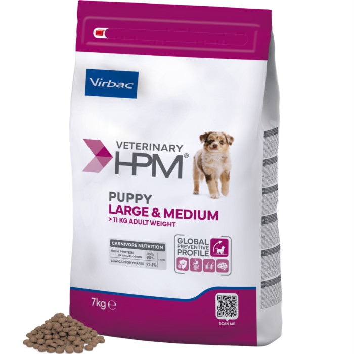 Virbac HPM Puppy Large & Medium Dog är ett helfoder utvecklat för att stödja tillväxt, immunförsvar och en sund utveckling hos valpar av medelstora och stora raser i den tidiga livsfasen. Det balanserade kalcium/fosfor-förhållandet främjar en hälsosam benutveckling. DHA från fiskolja bidrar till en hälsosam utveckling av hjärnan och inlärningsförmågan. Värmebehandlade laktobaciller, psylliumfibrer och bentonit hjälper till att stödja en stabil matsmältning och tarmflora.