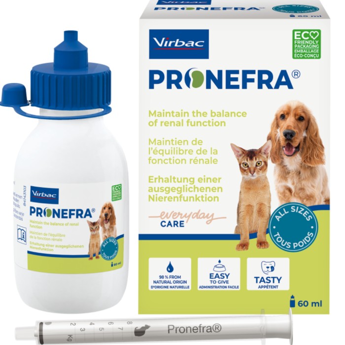 Virbac Pronefra är ett fodertillskott till hundar och katter med nedsatt njurfunktion. Pronefra binder avfallsprodukter som ansamlas i kroppen vid nedsatt njurfunktion. Det binder dessutom fosfat i mag-tarmkanalen för att minimera upptaget och motverka en felaktig fosforbalans.