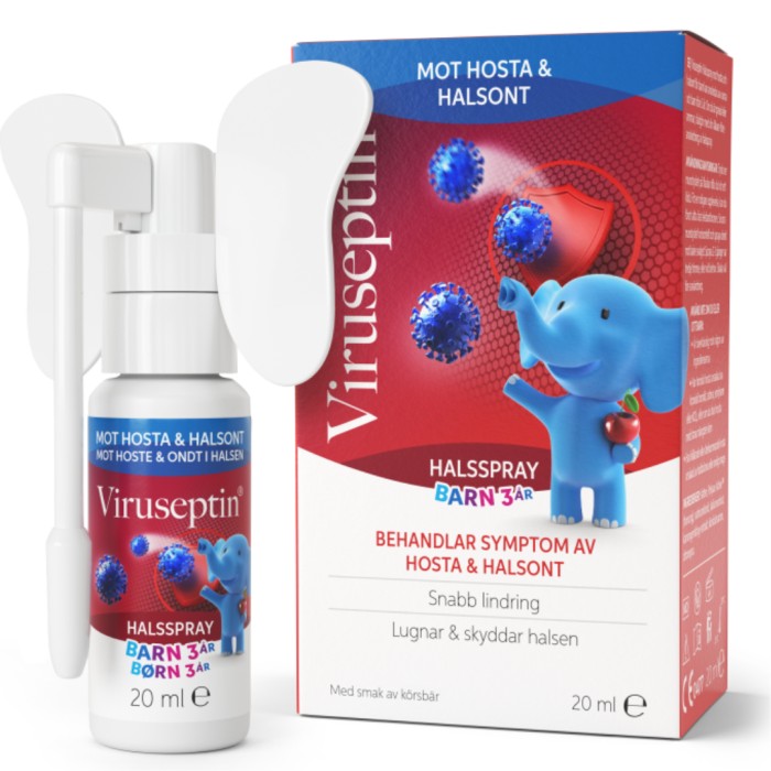 Spraya mot bakre svalget 2-3 gånger var tredje timme, eller vid behov. Skaka väl före användning. Viruseptin Halsspray mot hosta och halsont för barn kan användas av vuxna och barn från 3 år. Om du är gravid eller ammar, rådgör med din läkare före användning av halsspray.