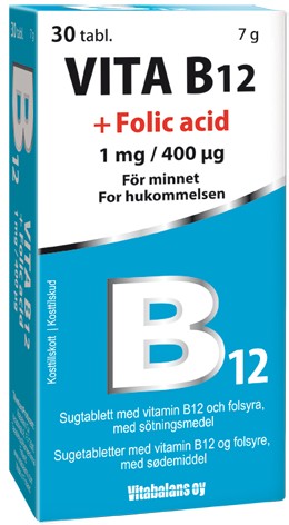 Vita B12 + Folsyra från Vitabalans är ett kosttillskott i form av en sockerfri sugtablett med 1000ug vitamin B12 och 400ug folsyra. Vitamin B12 bidrar till en normal ämnesomsättning och till nervsystemets normala funktion. Med folsyra som bidrar till att minska trötthet och utmattning.