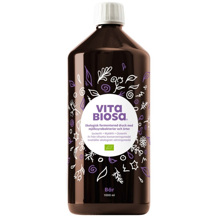 Vita Biosa Bär är en ekologisk och fermenterad dryck mjölksyrabakterier, örtextrakt och lite blåbär, svarta vinbär och aroniabär.