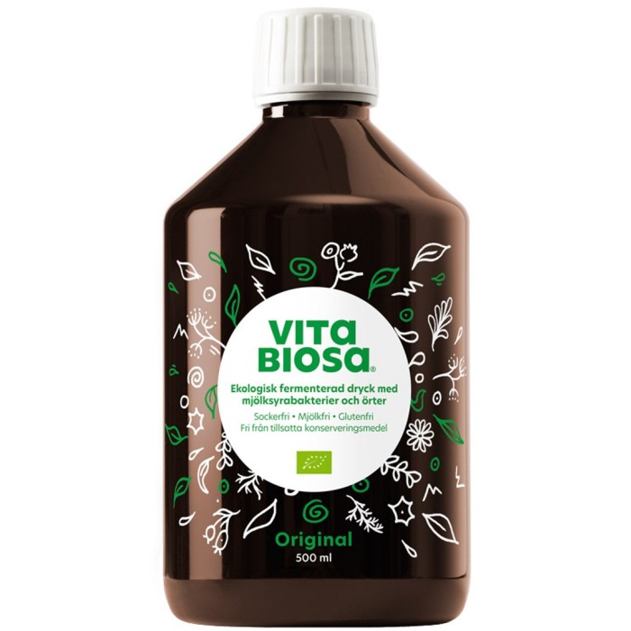 Vita Biosa Original är en ekologisk och fermenterad dryck med mjölksyrabakterier och örtextrakt.