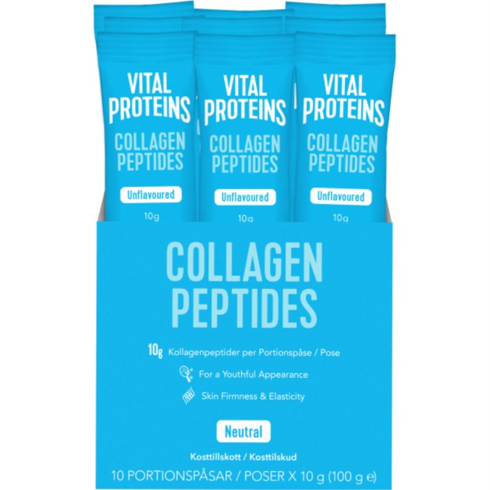Vital Proteins Collagen Peptides är ett kollagentillskott i pulverform med bovint kollagen (från nötkreatur). Pulvret har en neutral smak och kan tillsättas i både varma och kalla drycker, som vatten, te, kaffe, smoothies mm. Kollagen är ett protein, och protein bidrar till att bibehålla muskelmassan och normal benstomme. I takt med att vi åldras påverkas kollagenproduktionen i kroppen, vilket bland annat leder till att huden blir mindre elastisk.