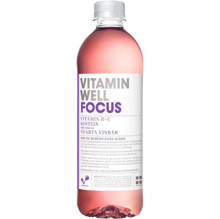Vitamin Well Focus är en dryck med smak av svarta vinbär som också innehåller koffein, vitamin C, B3, B5 och B12. Sötad endast med fruktsocker. Innehåller 4,2 g fruktsocker per 100 ml.