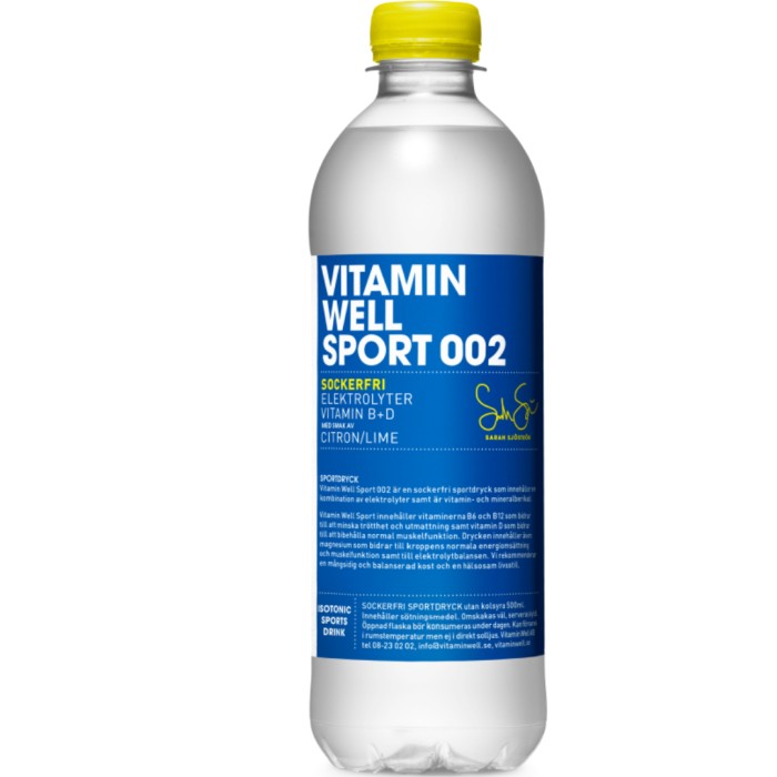 Vitamin Well Sport 002 är en sockerfri isotonisk sportdryck som innehåller en kombination av kolhydrater och elektrolyter samt är vitamin- och mineralberikad. Kolhydrat-elektrolytlösningen bidrar till att bibehålla uthållighetsprestanda under långvarig uthållighetsträning. Innehåller sötningsmedel.