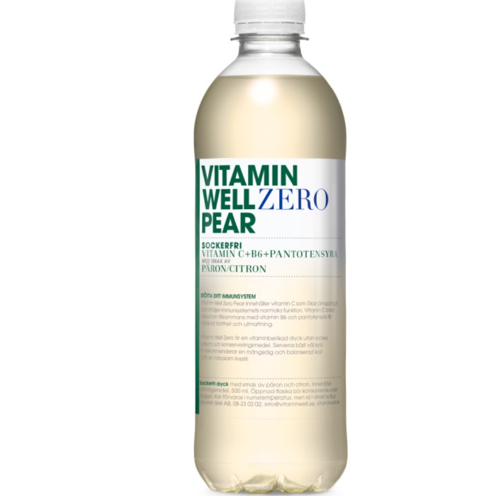 Vitamin Well Zero Pear är en vitamin- och mineralberikad sockerfri dryck utan kolsyra. Zero Pear har en en smak av päron. Innehåller sötningsmedel.