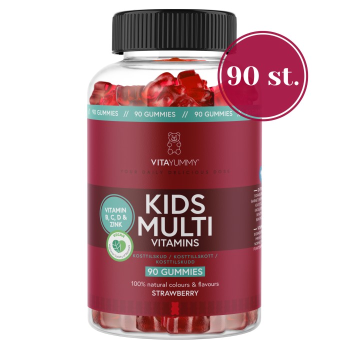 VitaYummy Kids Multivitamin med smak av jordgubb är ett kosttillskott i form av mjuka vitamintuggisar för barn från 3 år. VitaYummy Kids Multivitaminer innehåller ett komplex av vitamin A, flera olika B-vitaminer, vitamin C och D och mineralerna zink och jod. C-vitamin bidrar till immunsystemets normala funktion. D-vitamin bidrar till att bibehålla normal benstomme och normala tänder.