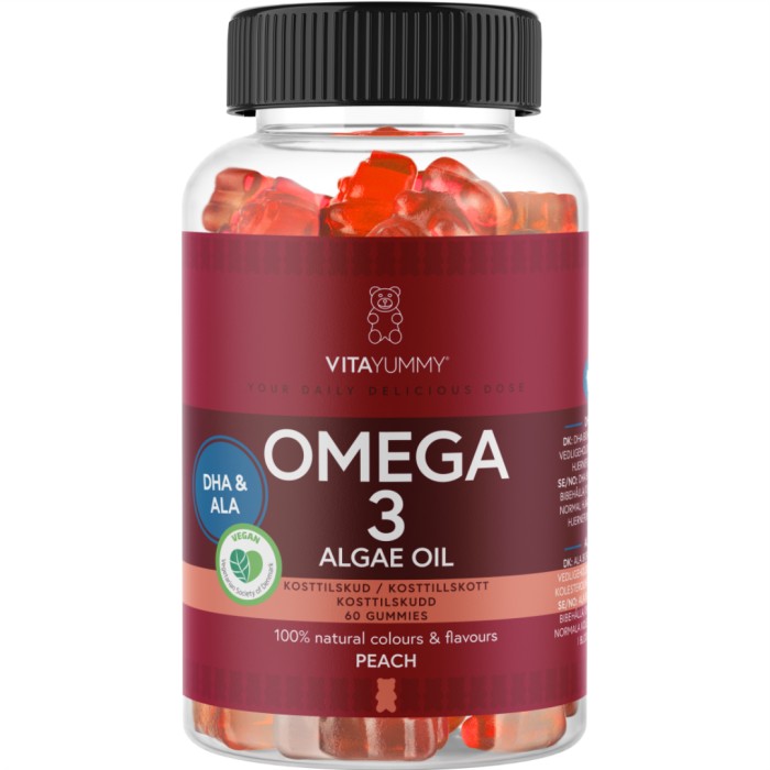 VitaYummy Omega-3 Peach är ett veganskt kosttillskott med omega-3 för vuxna och barn från 3 år. VitaYummy Omega-3 Peach innehåller både DHA och ALA och de aktiva substanserna kommer från alger och linfrö. DHA bidrar till att bibehålla normal hjärnfunktion och normal synförmåga*. ALA bidrar till att bibehålla normala kolesterolnivåer i blodet**. (*Den gynnsamma effekten uppnås vid ett dagligt intag av 250 mg DHA. **Den gynnsamma effekten uppnås vid ett dagligt intag av 2 g ALA.)