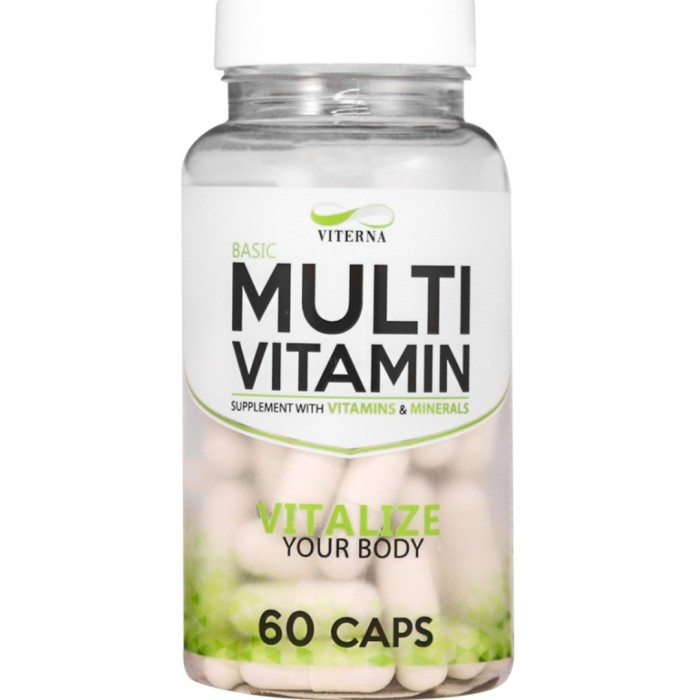 Viterna Basic Multi Vitamin är ett vitamin- och mineraltillskott. Innehåller bland annat vitamin C, zink, järn, vitamin E, vitamin B3, mangan, jod, koppar, pantotensyra, selen, vitamin D3, vitamin A, folsyra och krom.