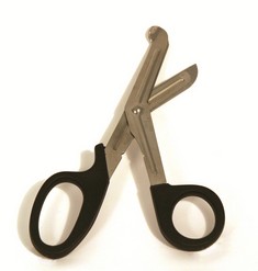 Förbandssax med böjd ände. Sax av metall med handtag av plast. Gör det enkelt att klippa i både tyg, häftande material och och större förband.