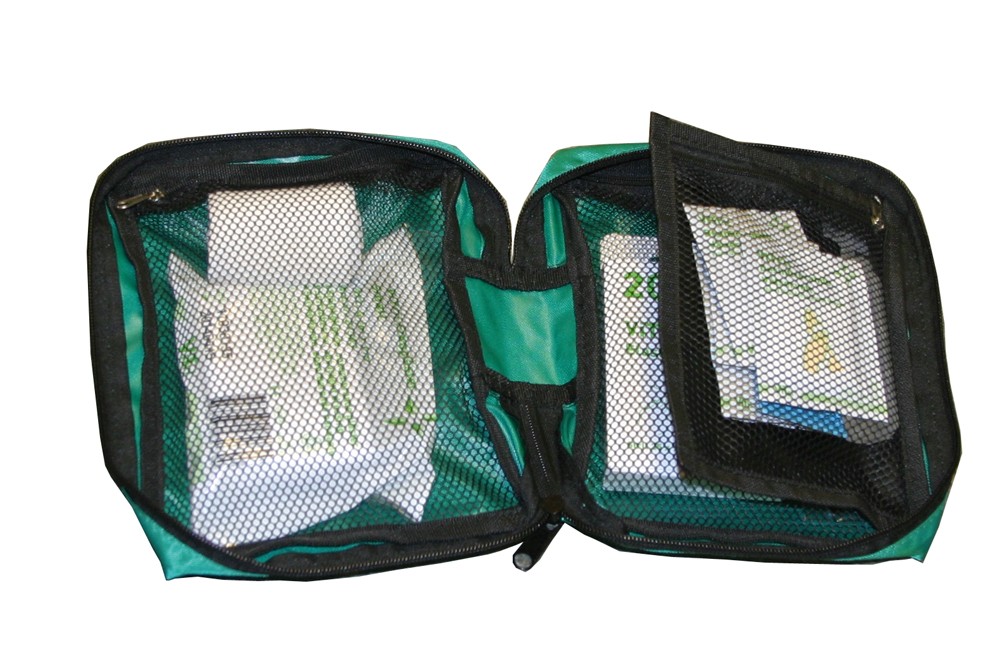 Kan fästas på bälte eller annat med de påsydda remmarna på väskans baksida. Väskan har tre sektioner, totalt tre fickor av nät med blixtlås till varje separat ficka. En smidig förbandsväska som går bra att med sig på t ex barnvagnen.