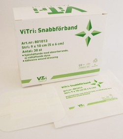 ViTri Snabbförband sterilt är ett självhäftande förband av non-woven med absorberande, ej vidhäftande sårdyna. Lämpligt vid skavsår, skärsår och skrubbsår. 9 cm X 10 cm (sårdyna 5 cm x 6 cm).