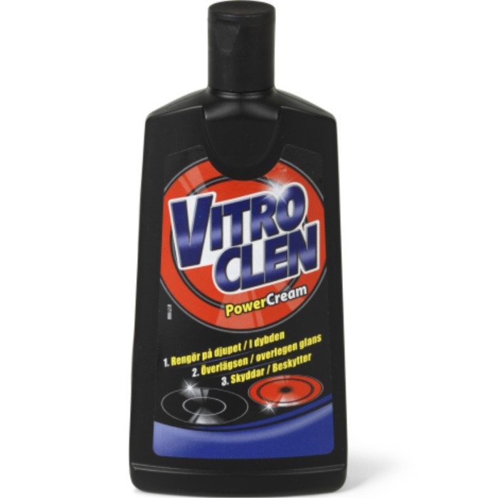 Vitroclen Power Cream används för rengöring av glaskeramiska hällar. Framtagen för att få även envisa fläckar att försvinna. Vitroclen är särskilt lämplig att använda på glaskeramiska hällar, där smuts har bränts fast, fläckar som annars kan vara svåra att bli av med. Krämen kan också med fördel användas på exempelvis induktionshällar.